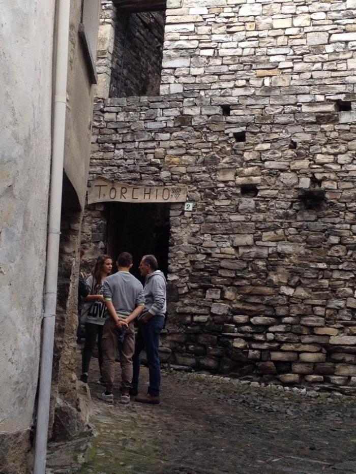 Anche ora, a volte, torno ad assaporare la tradizione durante la Festa del Torchio, che si tiene ad ottobre, di domenica. Il torchio si trova all’interno di un rustico nel centro del paese. Sulla pietra che lo sostiene è incisa una data, quella del 1572. Questo fa intuire la semplicità della struttura e la sua composizione fatta di un tronco di castagno, probabilmente ricavato da un albero della zona. L’uva che fuoriesce viene raccolta in botti di legno per la conservazione futura del vino.
