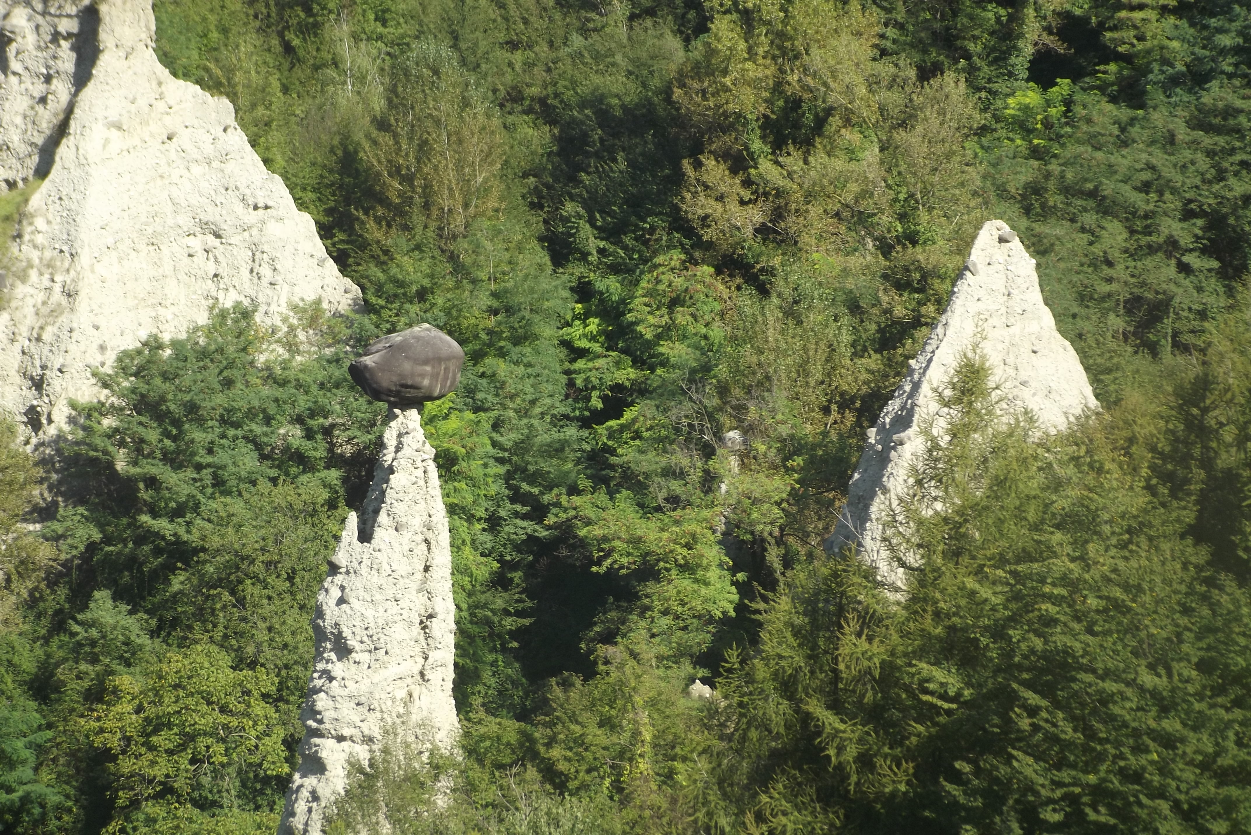 Sulla sommità delle piramidi si trovano dei massi che fungono da protezione e sembrano dei veri e propri cappelli. Nell’immaginario collettivo ricordano molto i “Camini delle Fate” in Turchia. Un sentiero che parte dal paese conduce al belvedere, dove avere una visuale ampia e spettacolare del paesaggio sottostante, ma questo miracolo della natura è visibile anche dalla strada principale.