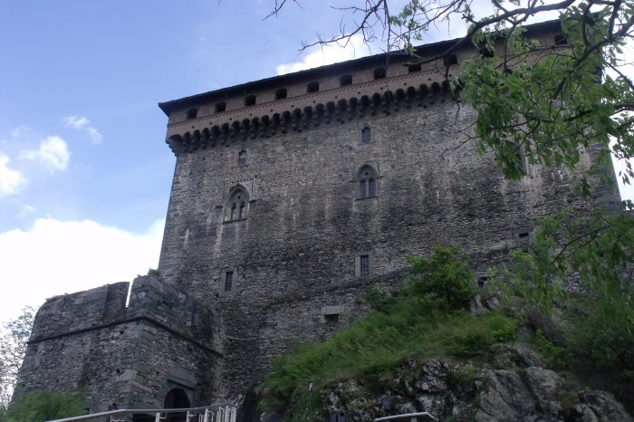 Salendo più in alto, il castello di Verres si presenta alla vista con la sua semplicità, circondato dal verde e dalla natura. Il castello è imponente e monoblocco, con muri fortificati e quindi praticamente inespugnabile. La guida ci ha spiegato che per i nemici, nel passato, c’erano sempre vari tipi di trappola. Insomma una vera accoglienza mortale! Lo scalone interno, molto ampio, serviva anche a scopi difensivi; infatti da qui venivano versati enormi secchi di acqua ustionante e lanciate pietre pesantissime. I camini, sempre presenti nelle varie stanze, sono una delle curiosità del castello, che doveva essere molto freddo nella stagione invernale. Forse è stata la mia visita preferita. Davvero emozionante! Il prezzo del biglietto è stato speso bene!!!