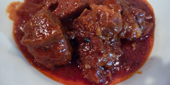 Tagliare la carne a pezzi, di dimensioni non troppo piccole. Spellare i pomodori tagliandoli a pezzi grossi oppure usare i pelati, tritare l’aglio e mettere questi ingredienti insieme in un contenitore, ancora meglio se di coccio. Aggiungere gli aromi sopra elencati insieme al sale e al pepe. Coprire il tutto con il vino e cuocere a fuoco lento per almeno due o tre ore. Consiglio: più cuoce la carne e più diventa saporita e morbida. Versare di tanto in tanto il vino, per evitare che si asciughi troppo il preparato. Si può aggiungere ulteriore pepe a seconda delle proprie preferenze.