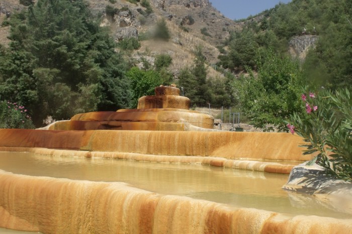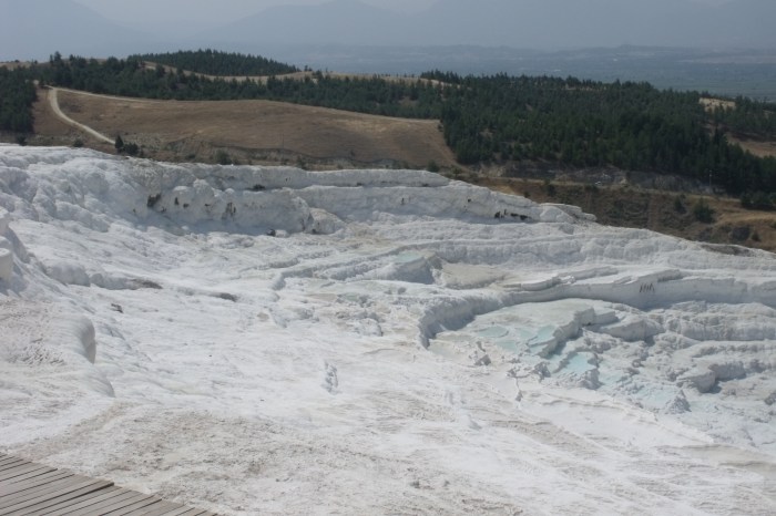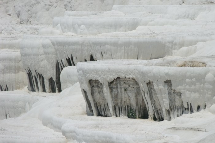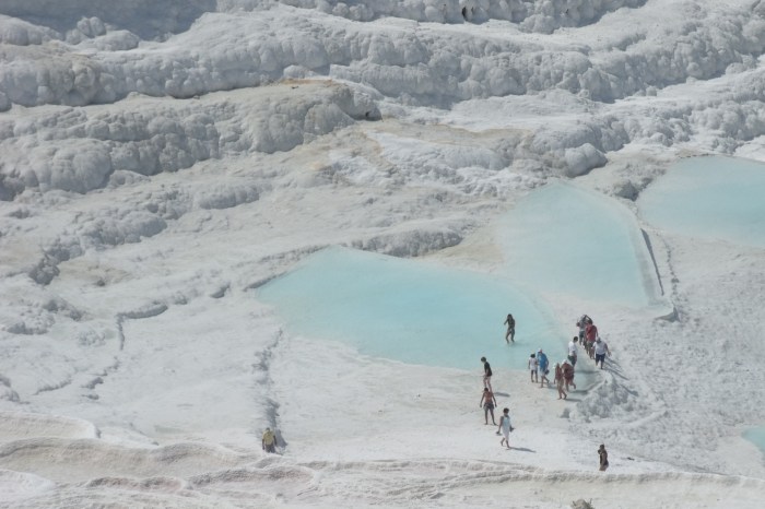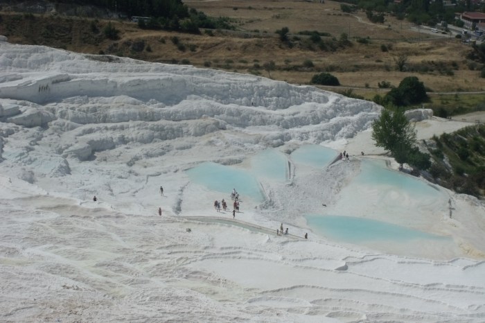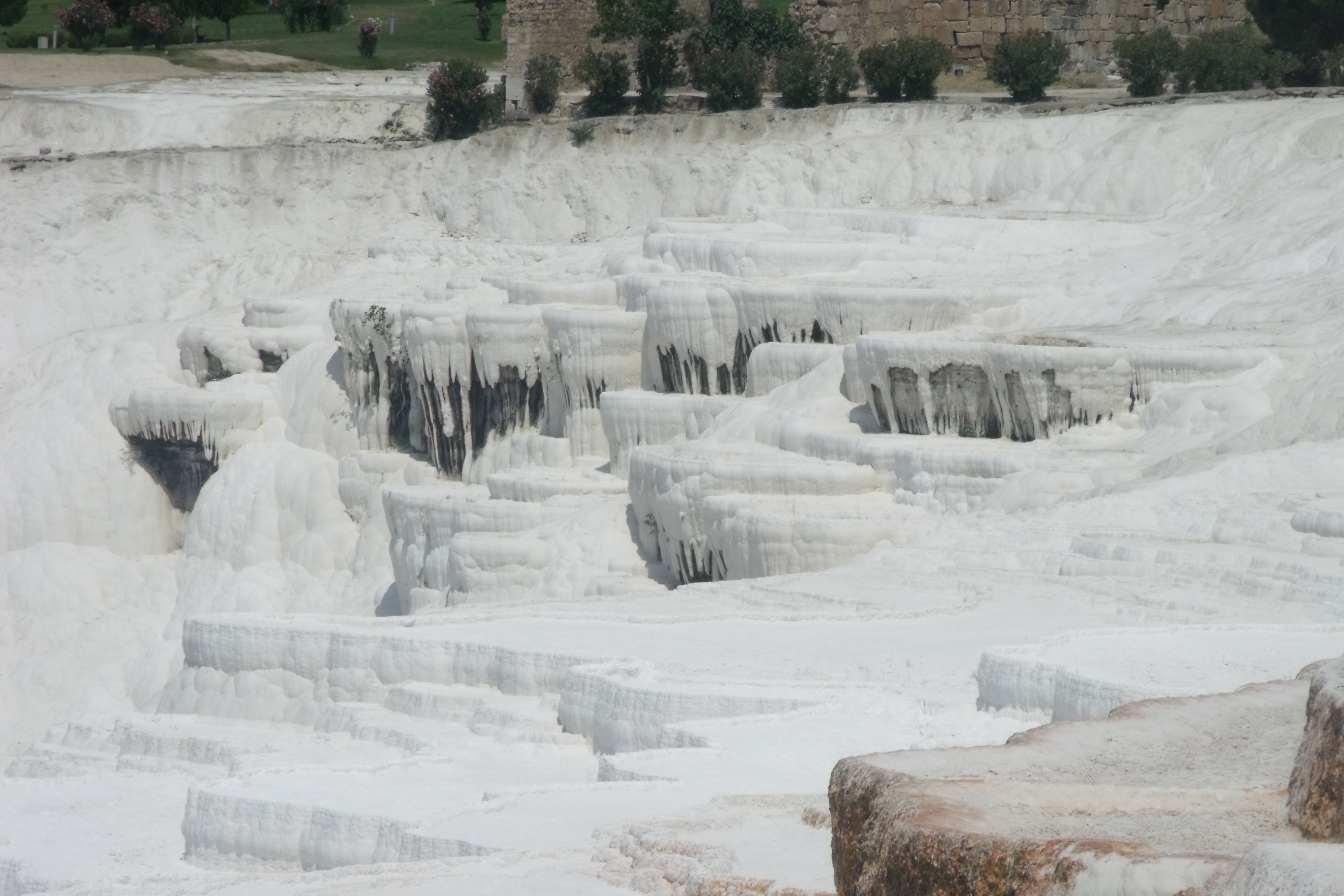 Un altro bellissimo luogo, che ci ha lasciato il segno, è Pamukkale, con le sue cascate pietrificate. Una levataccia di prima mattina, per affrontare molte ore in pullman, è valsa comunque il viaggio. Davanti allo spettacolo delle cascate, niente e nessuno può guastare l’atmosfera idilliaca che si respira. Un bagliore di bianco e azzurro, derivante dalle cascate in travertino. Da lontano, sulla strada, si vede solo uno spazio bianco, mai si può immaginare una merabiglia del genere!!! Frutto di un costante lavoro di pulizia, questa attrazione naturale rimane sempre bellissima, piena di magia. Il suo nome significa “castello di cotone” e direi che non poteva esserci nulla di più azzeccato. Sembra davvero essere avvolti da una nuvola di cotone, inframmezzata dall’acqua che rende ancora più caratteristiche queste bizzarre formazioni rocciose. L’acqua, con residui calcarei, sfocia anche nelle terme, da provare assolutamente. La cosa da ricordarsi una volta che si mette piede nell’acqua delle cascate, è stare attenti a come ci si muove: il fondo è scivoloso e talvolta appuntito. Esperienza comunque unica da vivere!!! Il paesaggio tutt’intorno e le rovine dell’antica città di Hierapolis, renderanno speciale questa escursione. Con tanto di bagno termale e relax al sole di uno degli alberghi di Pamukkale.