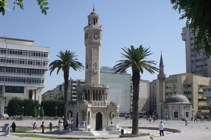 Da non perdere, per conoscere anche la realtà cittadina, Izmir. Terza città della Turchia, frenetica, arroccata alla montagna ma protesa verso il mare, moderna ma con monumenti storici, è brulicante di vita. Una passeggiata sul lungomare permette di assaporare un po’ di brezza e di ammirare le moschee e le abitazioni del centro e dei dintorni. La Torre dell’Orologio in pieno centro e la Moschea di Konak, con decorazioni in piastrelle di ceramica colorata, sono i simboli della città. Camminare per le vie del centro è rilassante, fino a quando si incontra il Gran Bazar, vivace, pieno di gente e merci di tutti i tipi. Anche qui la contrattazione è obbligatoria, per potersi aggiudicare un capo di abbigliamento, una borsa o uno dei più svariati oggetti esposti. Dopo un bel giro e lo shopping, ci si può sedere all’aria aperta per gustare una delle specialità turche. Tutto questo per un prezzo decisamente ridicolo e una quantità a dir poco abbondante. Questa città spensierata, conquista minuto per minuto, nonostante la sua bellezza non sia clamorosa. Rimane comunque un luogo vivibile, da visitare e amare.