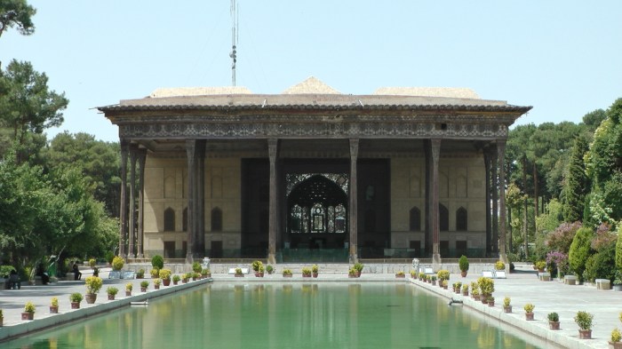 Camminando in centro, ecco un altro bel palazzo, il Chetel Sotun o Palazzo delle 40 colonne. In realtà il numero delle colonne non è reale, ma è simbolo di grandezza e prosperità. In realtà il numero giusto sarebbe 18. Sì, 18 colonne in legno all’ingresso, circondate dalla bellezza del parco antistante e da una bella piscina. All’interno ci sono bellissimi affreschi da ammirare e diverse sale che in passato erano adibite a banchetti, anche decisamente ben affrescate.
