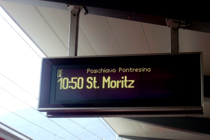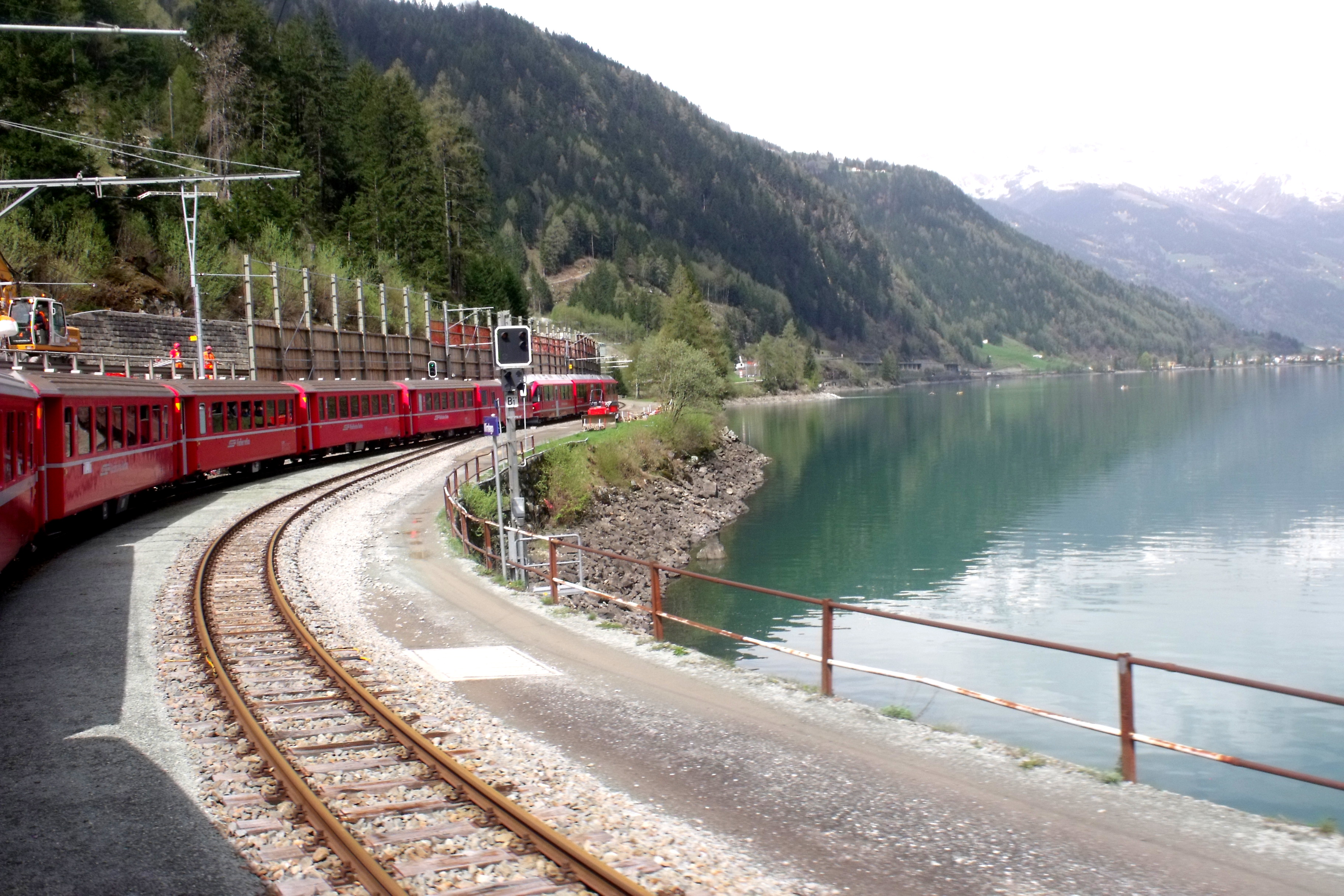 Si scende ancora per arrivare a Pontresina e intravedere ancora un bel nucleo di case, circondate da prati verdi e montagne, che ormai sono più basse di quelle appena passate. Il trenino scorre ancora tra il verde della vegetazione e i colori della vita quotidiana… Si torna pian piano nella civiltà. Per fermarsi e scendere dal treno con gli occhi ancora lucidi ed emozionati a St. Moritz, bella e moderna cittadina adagiata su un incantevole lago.