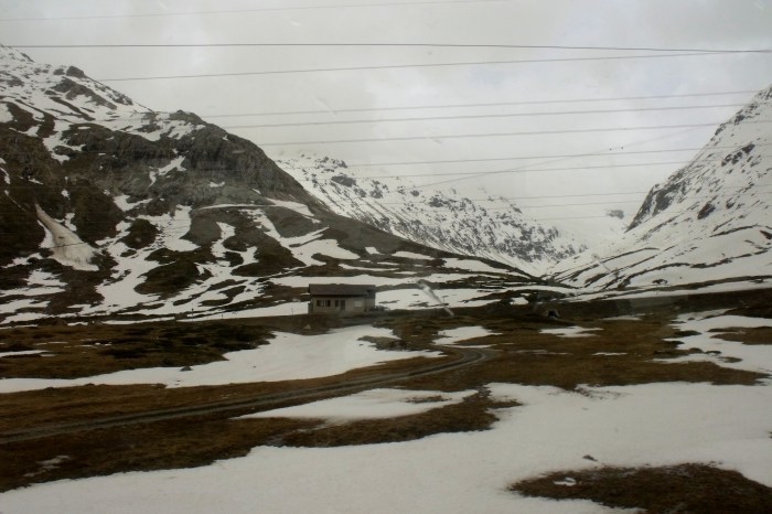 Dal finestrino si intravede la fermata di Morteratsch, la lingua del ghiacciaio Bernina. Paesaggio malinconico, innevato, solitario. Sembra un ambiente adatto alla meditazione, per rilassarsi dopo lo stress di tutti i giorni. Pace e tranquillità qui sono le uniche cose da apprezzare e vivere.
