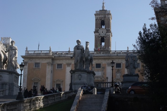 PIAZZA VENEZIA E ALTARE DELLA PATRIA, POI IL CAMPIDOGLIO. L’Altare della Patria, nel suo candido splendore, è dedicato al sovrano Vittorio Emanuele II (da qui anche il nome di Vittoriano). Mi ha colpito molto la costruzione con scalinate e terrazzamenti, che regalano davvero una vista formidabile sulla piazza e su una parte della città. Le colonne laterali, l’ingresso, tutto è divinamente creato per essere armonioso nelle forme. Quassù ci si sente importanti, davvero. Poi però, non può mancare una salita al Campidoglio, tramire la sua bella scalinata. La piazza del Campidoglio è circondata da tre splendidi palazzi: il Palazzo Nuovo, il Palazzo Senatorio e il Palazzo dei Conservatori, uno più elegante dell’altro. Il Palazzo Nuovo e il Palazzo dei Conservatori tra l’altro oggi ospitano i famosi Musei Capitolini, la galleria di sculture. Dal colle del Campidoglio non si può fare a meno di essere stregati dalla vista sul Foro Romano, davvero mozzafiato. Ci si starebbe ore e ore, per ammirare il cambiamento dei colori sotto la luce del sole.