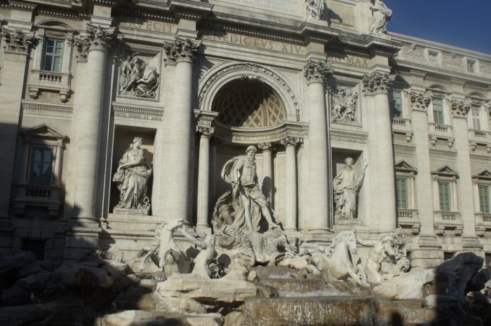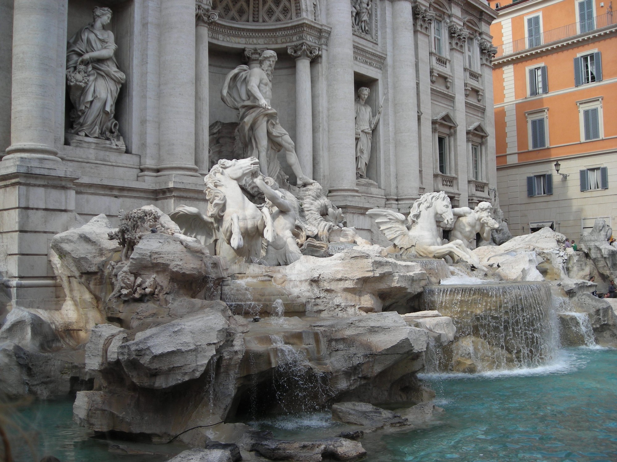 BUTTARE LA MONETINA NELLA FONTANA DI TREVI. La Fontana di Trevi, come poterla perdere? Incastonata in una delle piazze della città, sbuca quasi all’improvviso nella sua magnificenza. Immortalata in vari film, ho capito subito il perchè. Un intreccio di statue rende ancora più splendente la fontana, l’acqua limpida che ogni giorno accoglie migliaia di turisti, curiosi e gente del posto, che per avere un po’ di fortuna, gettano una monetina nella fontana. Beh si dice che chi butti la sua moneta, sia destinato a tornare a Roma… Allora io tornerò altre centinaia di volte… Con piacere direi. Il tema della costruzione è decisamente il mare. La piscina dagli angoli arrotondati accoglie i visitatori tramite una piccola scalinata. Rocce, statue di cui una che rappresenta un leone e altre cavalli alati e tritoni, fanno da degno contorno.