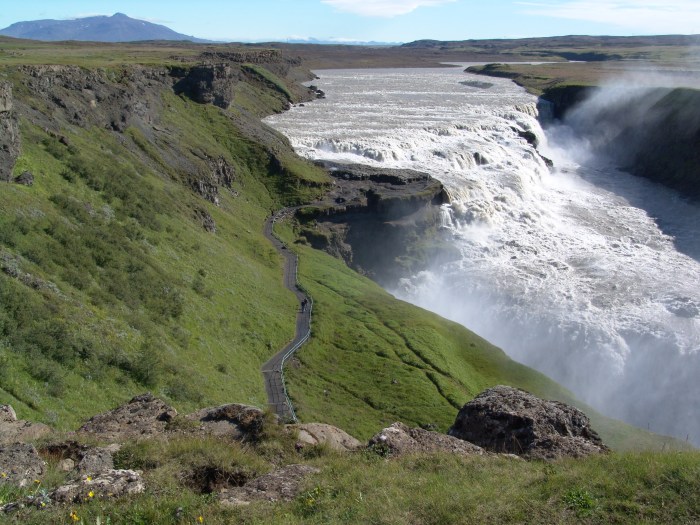 GULLFOSS. La cascata forse più spettacolare d’Islanda, imponente, fragorosa. E’ formata da due salti che vanno a finire il loro percorso in un canyon profondo e stretto. Qui si respira un’atmosfera magica, surreale. Durante le bellissime giornate è uno spettacolo imperdibile, ma anche con la nebbia o la pioggerellina fine, lo spettacolo è assicurato. Salti di 11 e 21 metri, con giochi di luce ed effetti naturali che lasciano letteralmente a bocca aperta. E’ difficile non rimanere incantati da un’opera della natura del genere. Vedere un arcobaleno non è poi così raro e fermarsi a fare infinite fotografie… beh, nemmeno quello. Sentieri percorribili tranquillamente a piedi permettono di visitare con calma la cascata e il paesaggio dei dintorni. Esperienza assolutamente da provare!