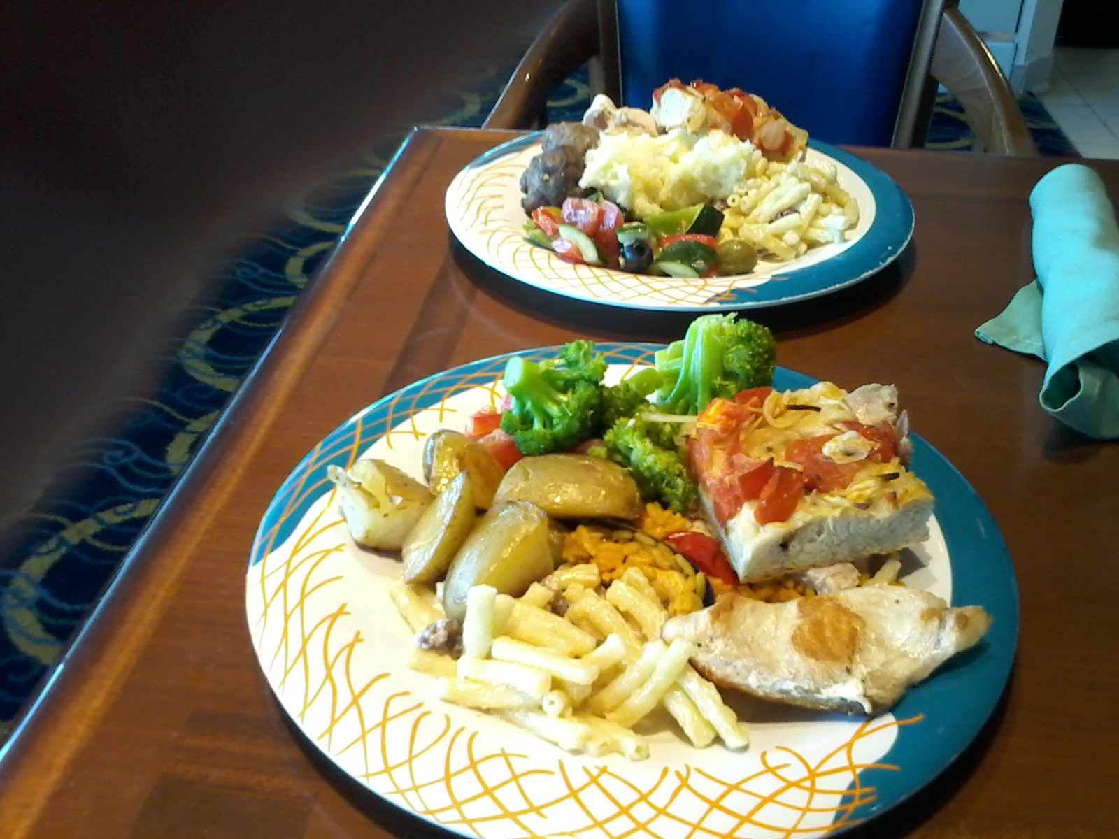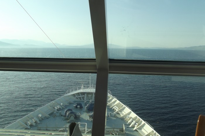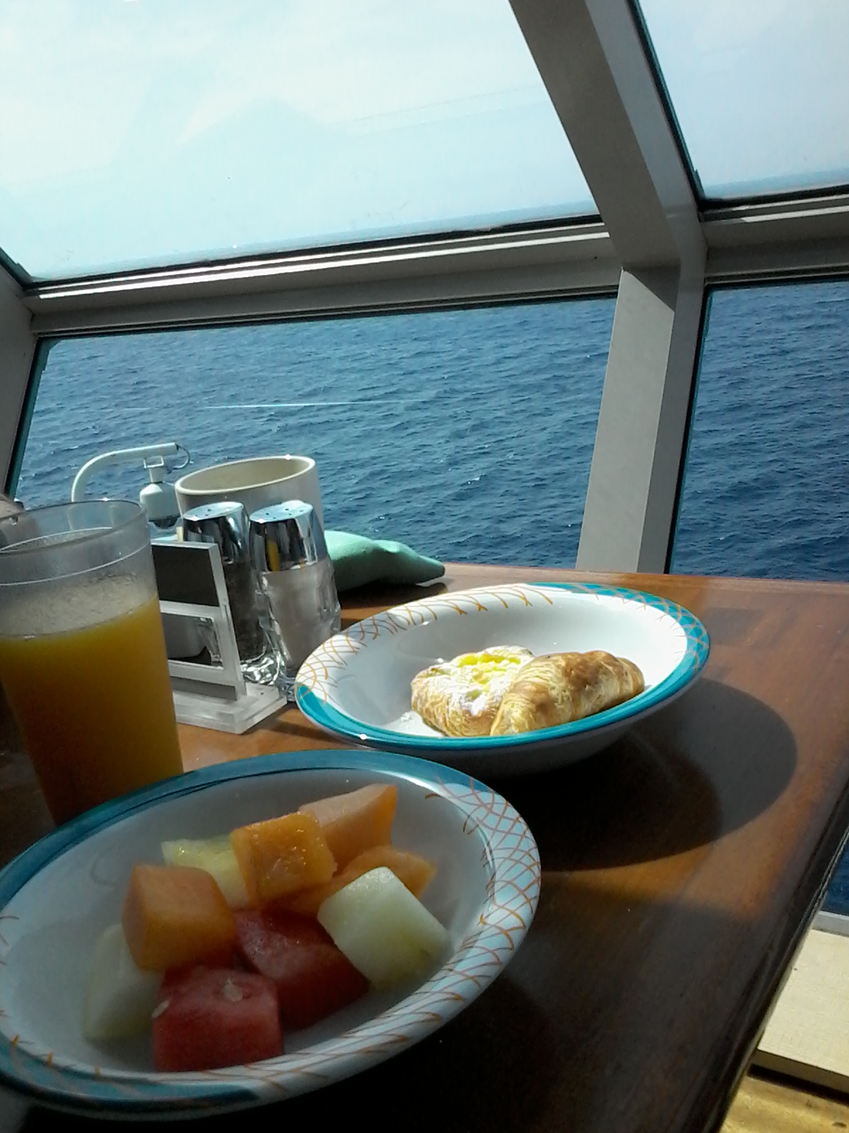 Eccoci pronti per una sana seduta in palestra… No, non è pazzia. Il benessere in vacanza può partire anche da qui. Oltre alla spa e al centro massaggi, la palestra è ben fornita di attrezzi. Con la vista del mare e dei delfini che a volte spuntano dall’acqua, è il massimo. Fatica con una vista spettacolare!!! Per iniziare bene la giornata e con la giusta carica. Giustamente, dopo gli esercizi e un sorso di acqua del dispenser, va fatta una buona colazione non trovate? I bar sulla nave sono innumerevoli ed il buffet di dolci e piatti salati del ristorante Windjammer è la cosa che più si avvicina alla perfezione. Brioches, panini con marmellata, dolcetti golosi, frutta, uova strapazzate, bacon, fagioli, salumi… Non manca proprio niente, oltre a spremute e succhi vari, caffè, the e bevande dissetanti. Ammirare la prua della nave mentre si fa colazione, non capita di certo tutti i giorni.