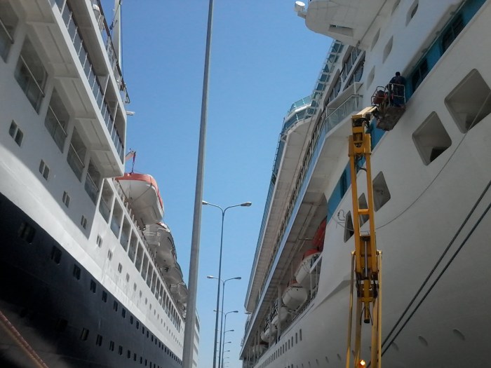 Nei giorni delle escursioni l’attesa e l’entusiasmo sono sempre alle stelle!!! E’ emozionante vedere la nave che si avvicina al porto, per attraccare o per rimanere al largo ed usufruire dei tender. Si è sempre in compagnia di altre navi da crociera ed è bello curiosare ed immaginare la vita degli altri croceristi. Chissà che tappe hanno toccato, quali attività hanno fatto… L’organizzazione di bordo è semplicemente perfetta e per le escursioni libere dove si sale sul tender, sono sempre a disposizione dei numeri per salire ordinatamente, senza troppo caos. Scendere mostrando la propria tessera e salire facendo altrettanto, impedisce equivoci e stabilisce un criterio per alzare il livello di sicurezza. Davvero ottimo!!! Comunque devo dire, vedere la nave al porto è davvero spettacolare!!! La grandezza e l’eleganza… Quante foto ho fatto? Direi molte!!!